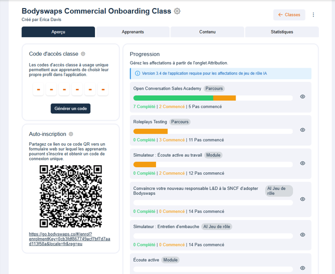 L’onglet Aperçu de la classe dans Bodyswaps vous permet de gérer l’accès à la classe, d’activer l’auto-inscription, et de suivre la progression des devoirs - le tout au même endroit.