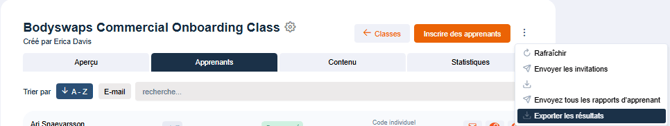 Utilisez les trois points à côté du bouton 'Inscrire des apprenants' pour exporter l’onglet Apprenants.