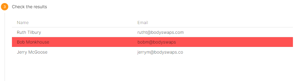 Toutes les lignes contenant des erreurs, comme un nom vide ou une adresse email invalide, seront mises en évidence en rouge et devront être corrigées avant de continuer.