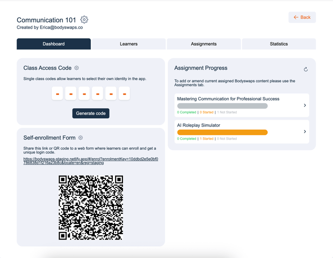The Classes Dashboard in Bodyswaps allows you to manage class access, enable self-enrollment, and monitor assignment progress—all in one place.
