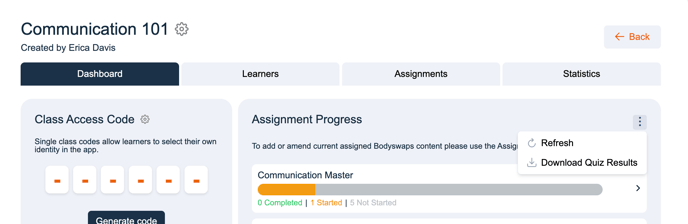 - Select the three dots next to Assignment Progress to export quiz and questionnaire results in .csv.