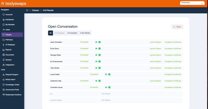 The Classes feature in Bodyswaps allows administrators to create and manage classes, enroll learners, assign simulations, and track progress—all from one streamlined dashboard.